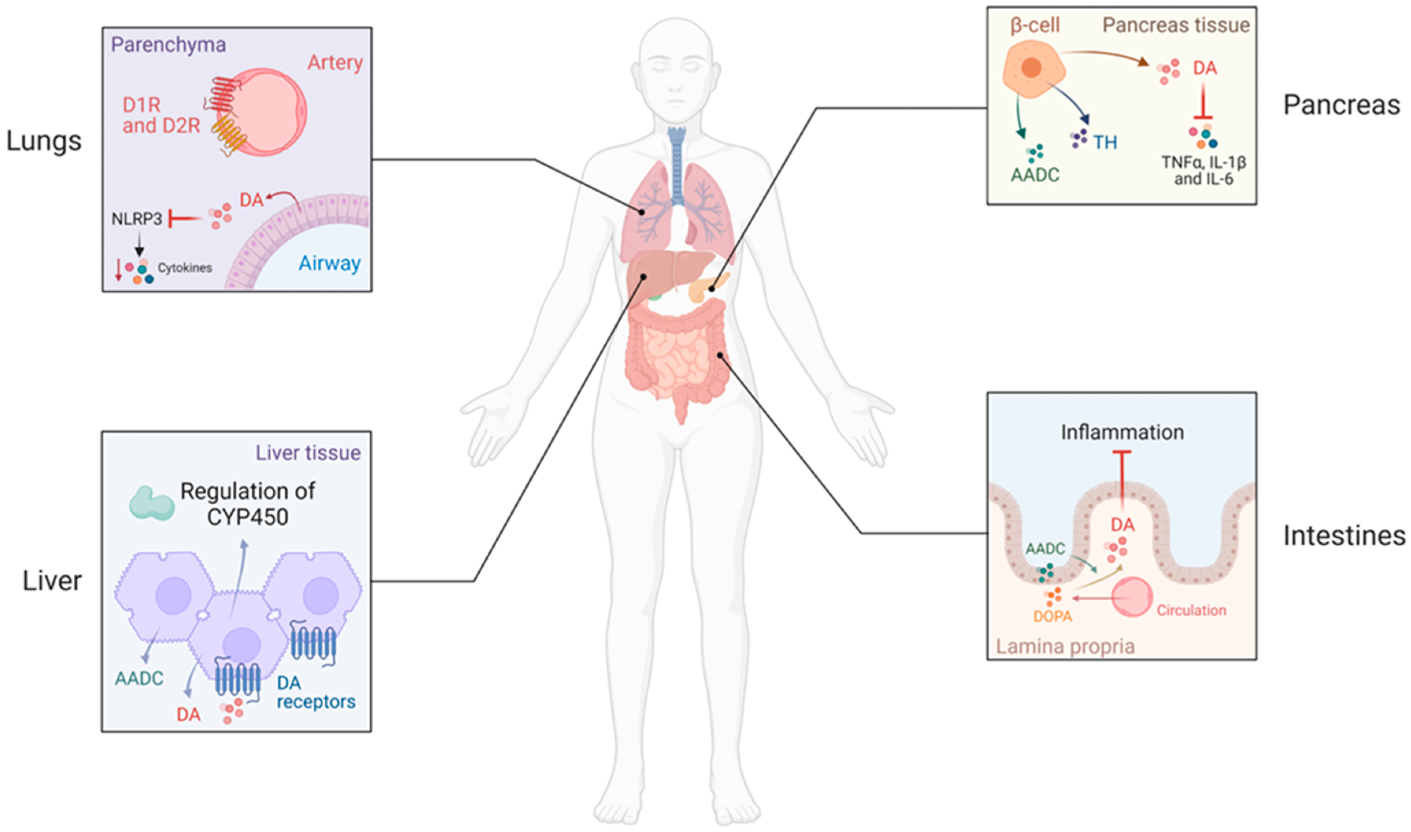 Peripheral dopamine (DA) production and actions. In the lung, alveolar type II epithelial cells can synthesize DA, which attenuates lung tissue injury, neutrophil infiltration, and inhibits inflammatory cytokine response through inhibition of NLRP3-signaling pathways. DA may also modulate ventilation by acting on dopamine D1 (D1R) and D2 (D2R) receptors in the arteries of the lung. In the liver, aromatic l-amino acid decarboxylase (AADC) is expressed, and DA is produced by hepatocytes. D2R can modulate the regulation of components of the cytochrome P450 (CYP450). Moreover, DA may protect the liver from acute injury. In the pancreas, DA is synthesized mainly in β-cells that intracellularly express TH and AADC and regulate insulin production in these cells. DA reduces the increased expression of inflammatory cytokines (TNFα, IL-1β, and IL-6) induced by cholecystokinin in acute experimental pancreatitis. In the intestines, DA is abundant in the mucosal cell layer; the epithelial cells of the intestinal mucosa are rich in AADC and circulating DOPA is taken up to produce DA. DA reduces the inflammation in human inflammatory bowel disease.Peripheral dopamine (DA) production and actions. In the lung, alveolar type II epithelial cells can synthesize DA, which attenuates lung tissue injury, neutrophil infiltration, and inhibits inflammatory cytokine response through inhibition of NLRP3-signaling pathways. DA may also modulate ventilation by acting on dopamine D1 (D1R) and D2 (D2R) receptors in the arteries of the lung. In the liver, aromatic l-amino acid decarboxylase (AADC) is expressed, and DA is produced by hepatocytes. D2R can modulate the regulation of components of the cytochrome P450 (CYP450). Moreover, DA may protect the liver from acute injury. In the pancreas, DA is synthesized mainly in β-cells that intracellularly express TH and AADC and regulate insulin production in these cells. DA reduces the increased expression of inflammatory cytokines (TNFα, IL-1β, and IL-6) induced by cholecystokinin in acute experimental pancreatitis. In the intestines, DA is abundant in the mucosal cell layer; the epithelial cells of the intestinal mucosa are rich in AADC and circulating DOPA is taken up to produce DA. DA reduces the inflammation in human inflammatory bowel disease.8