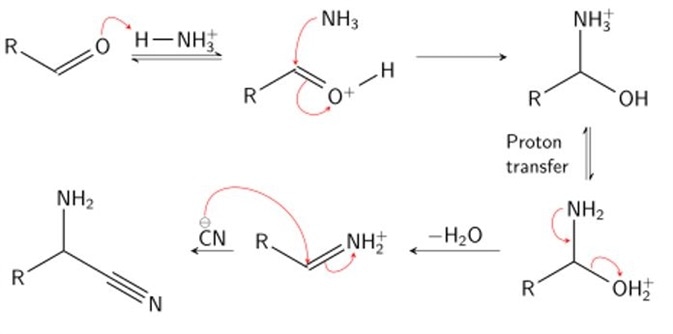 • Stage 1: Addition of ammonia and hydrogen cyanide to an aldehyde to form an α-amino nitrile.