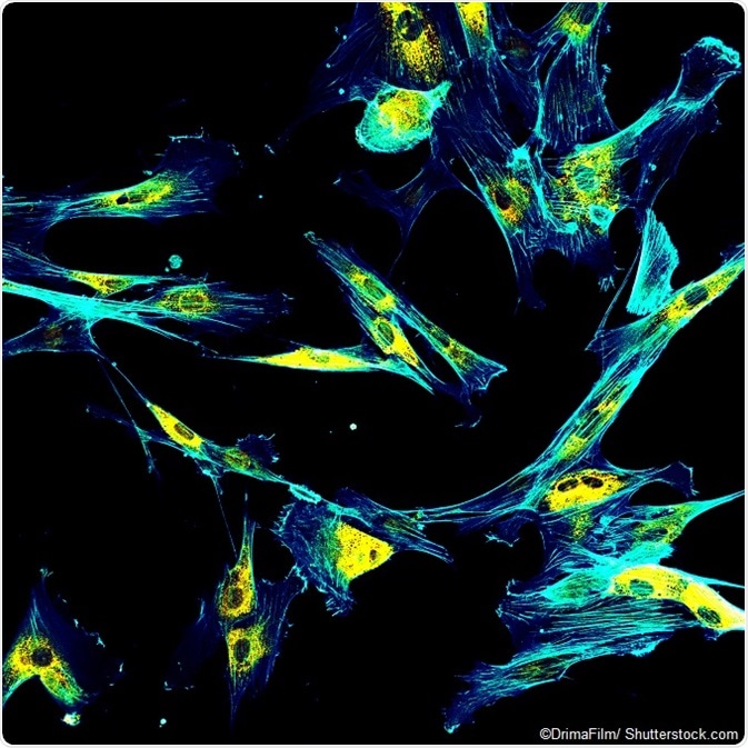 IMAGE: Immunofluorescence confocal imaging of fibroblasts with endoplasmic reticulum in yellow and cytoskeleton in cyan