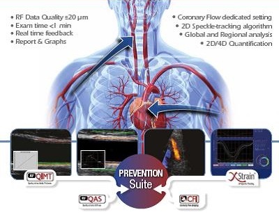 The four advanced technologies that make up Prevention Suite are CFI, XStrainTM, RFQIMT and RFQAS which measure coronary flow quantification, cardiac deformation indexes, carotid intima-media thickness and arterial stiffness, respectively. The vascular measurements are performed using RF signal analysis which provides high spatial resolution for greater accuracy.