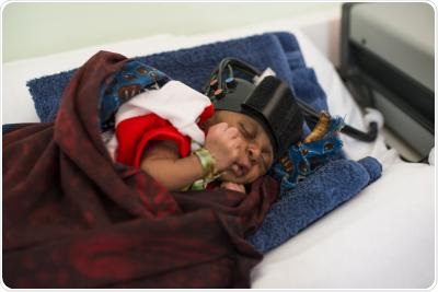 A baby wearing the functional near infra-red spectroscopy monitor. Credit: Bill and Melinda Gates Foundation