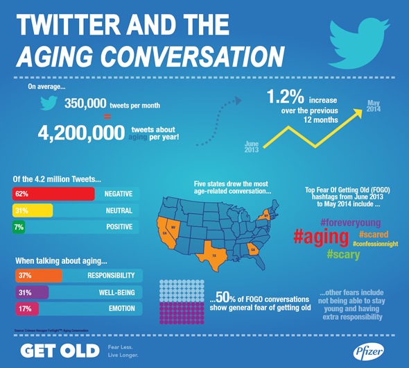 This year, Pfizer commissioned a study of Twitter and the Aging Conversation. We found that on average, there were about 350,000 tweets a month – totalling 4.2 million tweets in the last year - about aging.  So people are certainly talking about aging and their fears of getting old via social media channels.