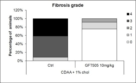 In this study, one group was treated with GFT505 and the results compared to those of the control group. The efficacy of GFT505 on NASH was assessed according to the same diagnostic criteria applied to the ongoing Phase 2b clinical study (GFT505-212-7: GOLDEN-505). Fibrosis was evaluated according to the scale classically used in the clinic, from Stage 0 (no fibrosis) to Stage 4 (cirrhosis).
