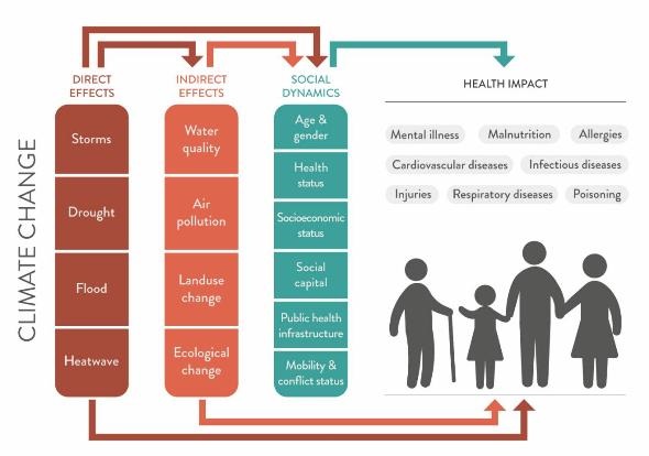 The report shows that the direct health impacts of climate change come from the increasing frequency and intensity of extreme weather events, especially heat waves, floods, droughts and storms. Indirect impacts come from changes in infectious disease patterns, air pollution, food insecurity and malnutrition, involuntary migration, displacement and conflicts.
