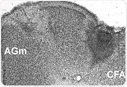 A cross-section of a mouse brain with the initial stroke showing as a gray region on the right. The second stroke was given in the region on the left labeled AGm. Credit: Courtesy of Neurorehabilitation and Neural Repair
