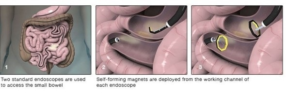 The dual-path enteral diversion was created with a flexible endoscope, as smart, magnetic devices are deployed from the scope and self-assemble in the small bowel. The devices transform from a linear shape to an octagonal geometry and then couple to form an anastomosis -- a connection between two hollow or tubular structures or organs. Coupled devices are eventually expelled naturally, leaving behind an anastomosis without residual foreign material. Patients enrolled in the study were restricted to a two-week post-op liquid/soft diet, underwent an upper GI series to confirm anastomotic patency (the degree of openness or exposure) at two weeks post implant, and received follow-up endoscopies at two and six months to visualize the anastomosis.