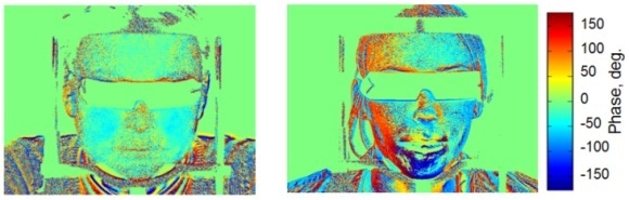 The distribution of a relative phase of blood pulsations on the face of a healthy person (left) and a patient suffering migraine (right).