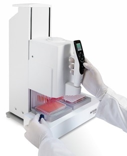 The VIAFLO 384 is a handheld 384-channel electronic pipette that enables fast, precise and easy transfer of 384 samples simultaneously. Uniquely the VIAFLO 384 offers all the benefits of increased sample throughput as well as lower sample and reagent use without the expense of having to invest in a robotic liquid handling system. The VIAFLO 384 has been designed to be used just like a standard handheld pipette. Therefore, no special skills or training are required to operate it. Servo assisted motor steering ensure that operating the VIAFLO 384 is both effortless and precise. The VIAFLO 384 features the company's popular Touch Wheel™ pipette user interface enabling simple and fast programming of a wide range of pipetting modes including repeat dispense, serial dilute and mixing routines. The VIAFLO 384 comes with 10 pre-defined pipetting modes enabling the system to be used productively almost immediately. A further 40 user designated custom programs allow even the most diverse and complex pipetting operations. The VIAFLO 384 can be connected to a PC with VIALINK software enabling easy custom program exchange and firmware upgrades. Labs will immediately benefit from the increased productivity and high precision delivered by a VIAFLO 384.