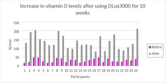 - All participants raised their vitamin D status (on average four and a half times) to an optimal level (>75n/mol)