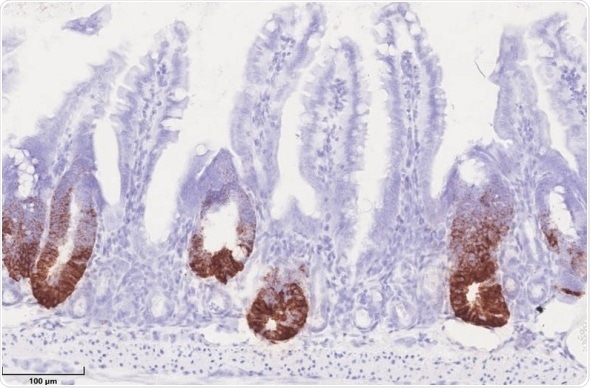 HSP60 in mitochondria control stem cell proliferation in the gut epithelium. HSP60 negative crypts show a loss of positive stem cells (brown staining), while stem cells hyperproliferation occurs in HSP60 positive gut epithelium. (Photo: Team Haller/ TUM)