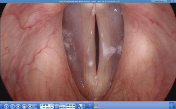 The camera’s CCD element is exposed to the moving image by a pulse of high intensity light that lasts a fraction of a second (0.000005 sec.). This time period represents a very small percentage of the glottal cycle thereby producing a crisp image with good edge detail and a clear picture of vascularity. Superior pitch tracking, throat mic or EGG input for Fo detection ensures the system quickly locks to the voice’s fundamental frequency. The system also includes enhanced recording facilities including easy report generation, still image capture and DVD burning.