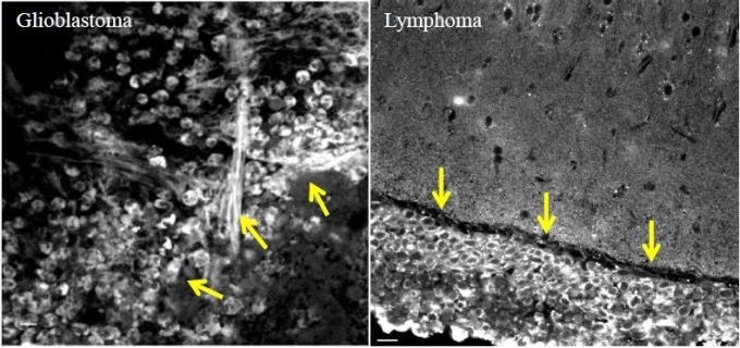 Sample Images: Immediate and specific diagnosis of two common brain tumors with vastly different treatment plans. Separate nanoprobes specific for glioblastoma (GBM) and lymphoma show many brightly staining tumor cells in the GBM biopsy and the characteristic circular staining pattern in the lymphoma biopsy. Tumor and brain margins (yellow arrows). Scale bars 20 μm.