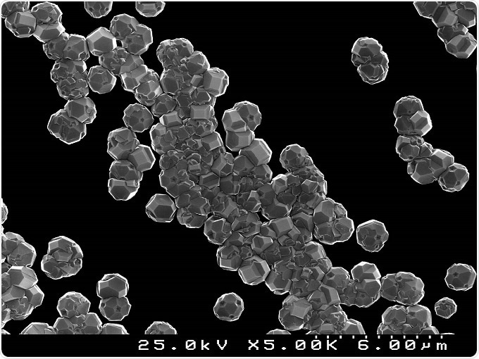 Nano diamond particles, grown synthetically in the lab. The crystals can be seen clearly, on an average being about 100nm in size. CC 4.0 D. Mukherjee.