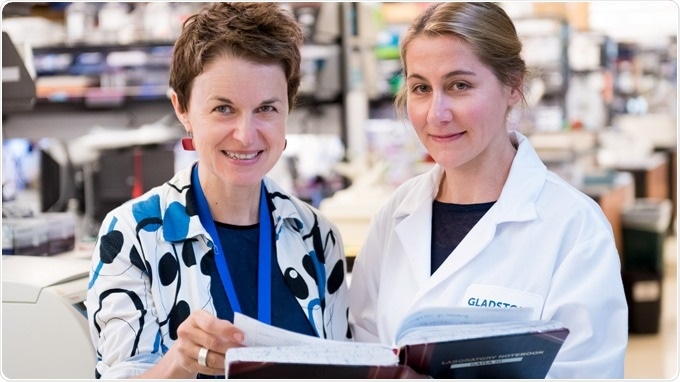 Melanie Ott (left) and Daniela Boehm (right) uncovered a new therapeutic target for flushing out latent HIV. [Photo: Chris Goodfellow, Gladstone Institutes]