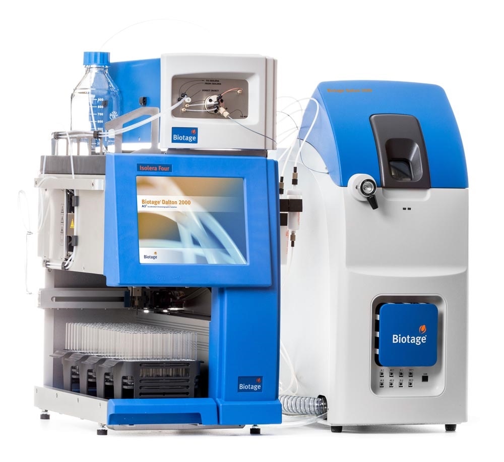 The system can isolate, not only known compounds, but also unknowns using the novel ‘Collect on Total Ion Counts’ feature to further assist in the sample separation. Isolera™ Dalton 2000 uses a single quadrupole with positive and negative polarity switching. This enables all charged fragments of your sample to be detected at the same time. Together with an intelligent post analysis tool, you can confirm that your compound is both correct and pure”