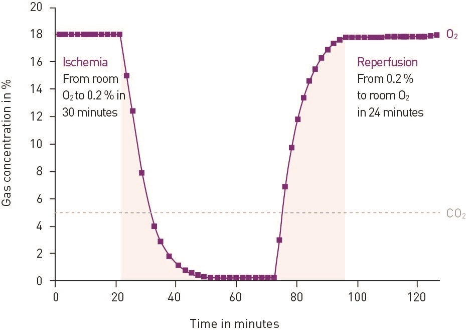 Hypoxia and ischaemia/reperfusion are often related to life-threatening diseases. Reduced O2 and nutrient supply due to impaired blood flow occurs during stroke, myocardial infarction, shock, atherosclerosis and cancer. Investigating these changes in vitro requires an experimental set-up capable of rapidly re-oxygenating (to mimic reperfusion), and to monitor in parallel critical biological parameters.