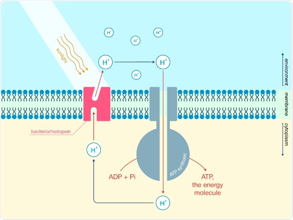 Bacteriorhodopsin is a photosensitive protein that is part of the membranes of some microbial cells. (In fact, there are quite a few of such proteins, but the one used in this study was taken from Halobacterium salinarium.) One end of the protein sticks out on the outside of a cell, while the other end is on the inside. Sunlight causes bacteriorhodopsin to pump protons out of the cell, which enables the cell to synthesize energy in the form of adenosine triphosphate. Incidentally, the human body produces a total of about 70 kilograms of ATP every day.