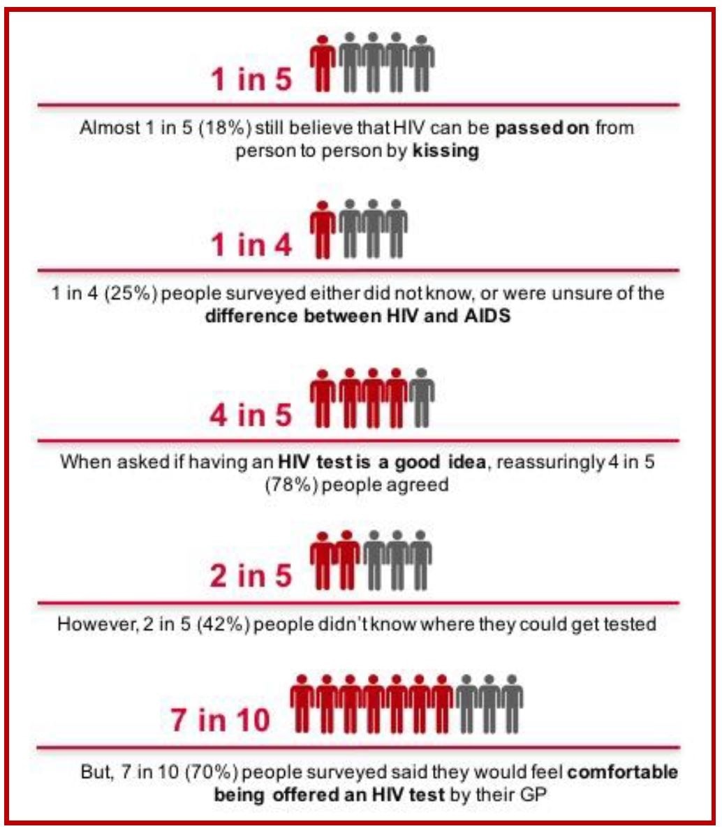 Almost 1 in 5 (18%) people incorrectly said that HIV can be passed from person to person by kissing, and 1 in 4 (25%) didn’t know, or were unsure of, the difference between HIV and AIDS.