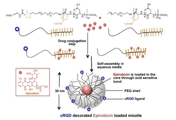 Synthesis and structure of cRGD-decorated epirubicin-loaded micelles, shown to lead to the suppression of gliobastoma multiforme tumors in a mouse model.