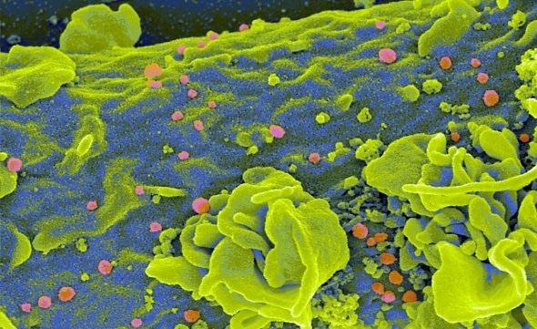 Complement-coated HIV (pink) attached to a dendritic cell (green-blue). Quelle: Wilflingseder D./Pfaller K.