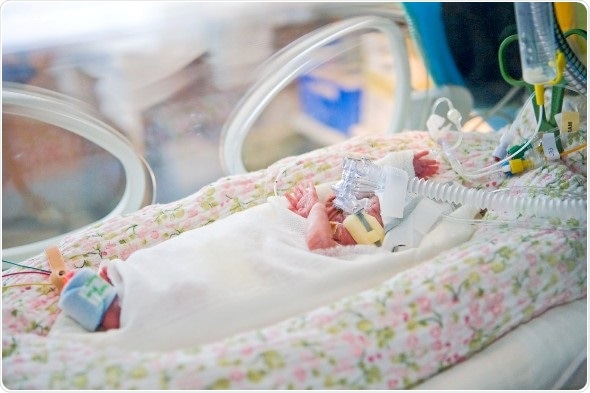 A pre-term baby with a birth weight of less than one kilogram receiving assistance with breathing in an incubator. Feeding with breast milk should be feasible by means of a gastric tube in the early weeks of life. Before that, vital nutrition is delivered intravenously. Quelle: Medical University Vienna