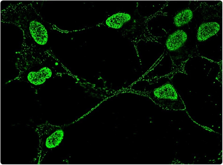 Neuronal cell line showing Angiogenin (green) in the nucleus and in the neurite outgrowths. Credit: Univeristy of Bath