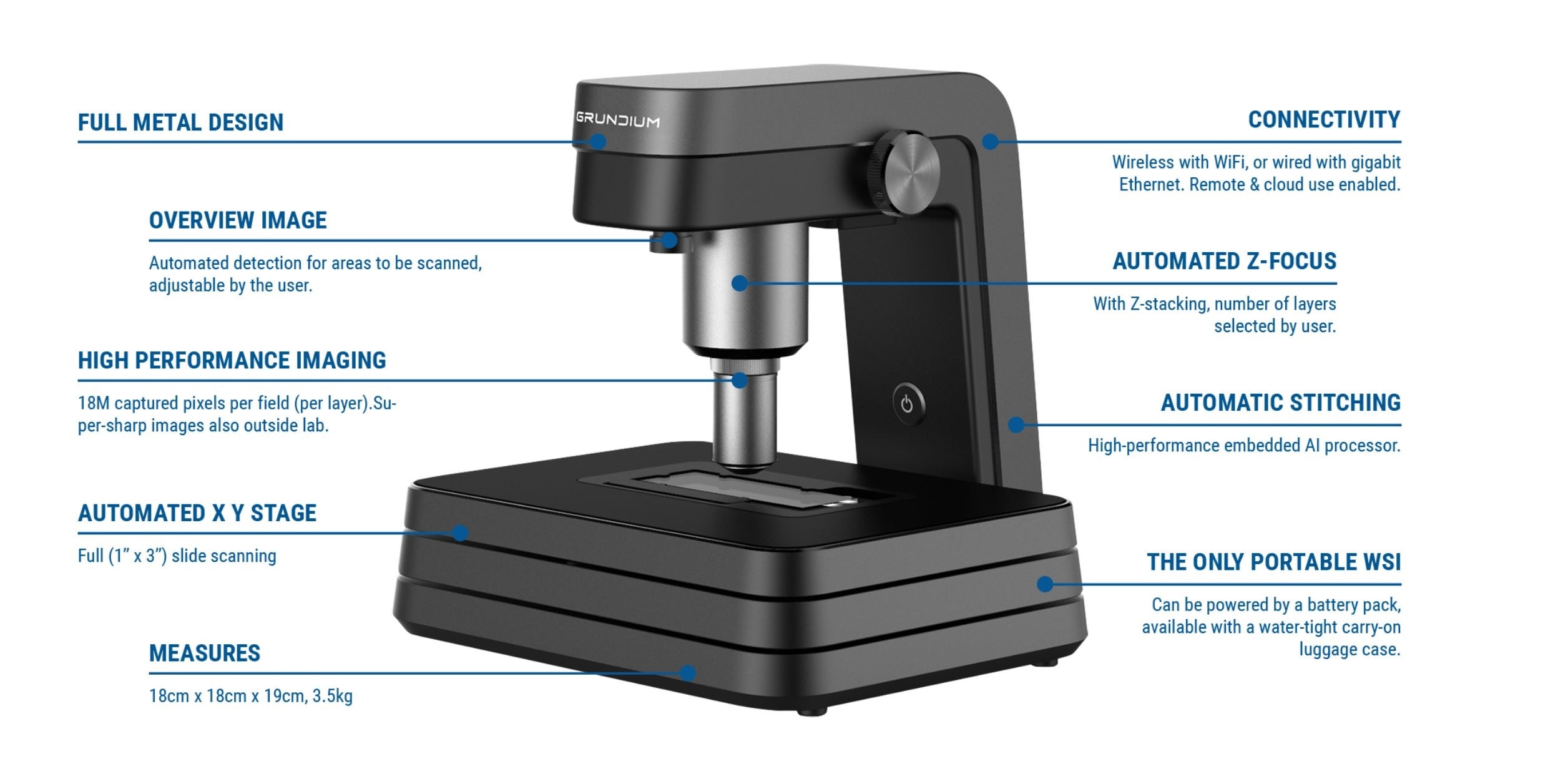 We are promoting the Grundium OCUS. We see it as a product to transform personal digital microscopy, making  clinicians and researchers lives easier by making daily work faster.
