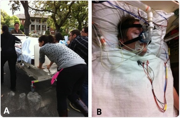 A) Transporting participants from the hospital to the test room. B) JV in the test room.