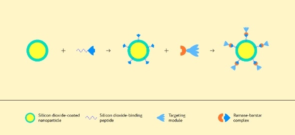Barnase and barstar can be used to engineer various functional modules for theranostics. For example, barnase can be bound to therapeutic agents — antibodies, drugs, fluorescent molecules, etc. — while barstar can be fused with a targeting agent. This concept was suggested by Sergey Deyev, the head of Molecular Immunology Laboratory of IBCh RAS. The two modules are then combined, forming a bifunctional compound, which has therapeutic and diagnostic properties, and enables targeted drug delivery. By fusing barnase and barstar with various therapeutic and diagnostic molecules, researchers can develop a range of theranostic agents based on the same principle. These molecular structures can be carried on the surface of nano- or microparticles. The particles themselves can have auxiliary properties, including fluorescence or the ability to be destroyed when exposed to radiation, killing off the surrounding harmful cells, such as cancer cells. Dozens of molecular structures of different types can be deposited on a tiny particle, potentially increasing its therapeutic effects.