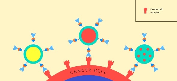 The researchers used silicon dioxide-coated particles as the carriers for their molecular complex. The primary targets of the biostructures described in the paper are cancer cells, identifiable by the HER2/neu oncomarker on their surface, shown as a red outgrowth in figure 2. HER2/neu is a protein responsible for cell growth and division and present in healthy cells. In cancer cells, however, this protein is in excess — or overexpressed — enabling them to grow and divide uncontrollably.