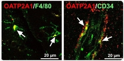 Immunofluorescence for Oatp2a1 in mice glial (left) and endothelial cells (right) in the brain. Immunoreactivity of Oatp2a1 (red color) was detected in F4/80-positive cells (e.g. microglia, green color) and in endothelial cells stained with CD34 (green color). White arrow indicates merge of fluorescence.