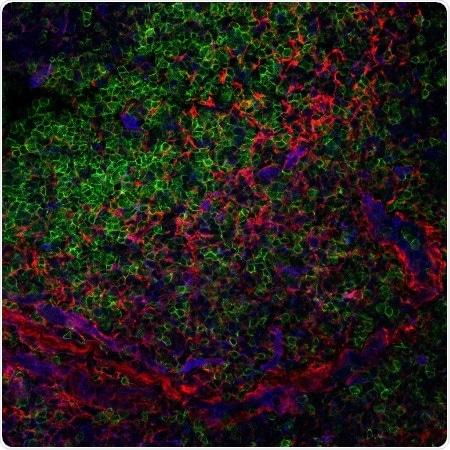 Section of a human tonsil depicting T cells (green) interacting with the FRC structural cells (red). COX2 (blue) is part of one of the mechanisms described that the structural cells use to control T cells (green). Credit: Sara Cruz Migoni