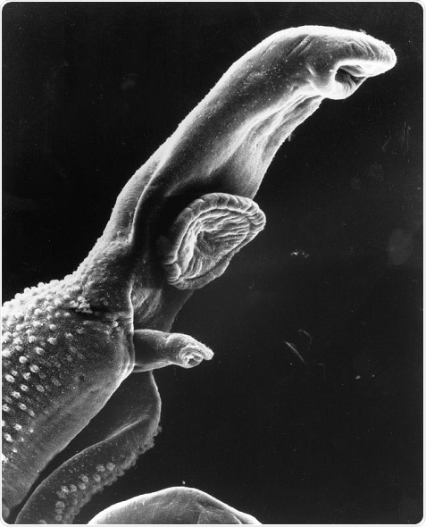 “Schistosome Parasite: This schistosome parasite enters the body through the skin of persons coming in contact with infested waters. The adult worm lives in the veins of its host. The parasite is magnified x256 in this photograph.” Image Credit: Wetzel and Shaefer, Wikimedia Commons, Public Domain, 2001