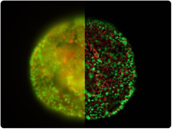 HeLa cell spheroid stained with Alexa Fluor 568 Phalloidin (Actin) and YOYO 1 iodide (Nucleus). Acquired with a standard wide field fluorescence microscope (left half) and an exposure of the same sample taken with a THUNDER imager (right half).