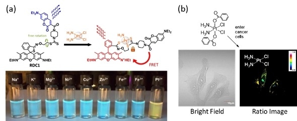 (Left, upper) Figure shows the Förster resonance energy transfer (FRET)-based fluorescent probe for the ratiometric sensing of cisplatin. (Left, lower) The probe has high selectivity towards Pt2+ ion as other biologically relevant metal ions (Na+, K+, Mg2+, Cu2+, Ni2+, Zn2+, Fe2+ and Fe3+) have no significant effect on its emission profile. (Right) Figure shows the application of the ratiometric probe to investigate the intracellular reduction of platinum(IV) prodrug complexes based on the cisplatin scaffold. [Credit: Angewandte Chemie International Edition]
