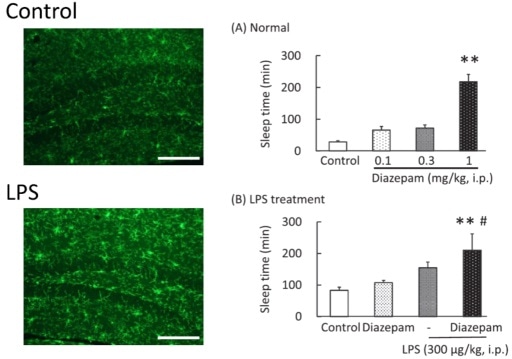 The bacterial toxin (LPS) activates microglia in the brain (observed by a brighter green signal), suggesting that inflammation was set in motion (left). Under normal conditions, only the highest dose of diazepam (1 mg/kg) increased the sleep time in mice (right top). However, once LPS triggered inflammation, even a low dose of diazepam (0.3 mg/kg) increased sleep time (right bottom).