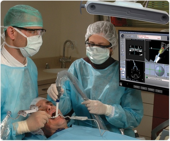 This new image-guided implant (IGI) system extends the use of CBCT scanners to include intra-surgical navigation and has real-time, speed of light, tracking with absolutely no on-screen lag. It also has sub-millimeter accuracy and a robotic auto-stop for maximum safety where the drill motor stops automatically and instantly turns off the drill if it is placed outside of the planned surgical area.