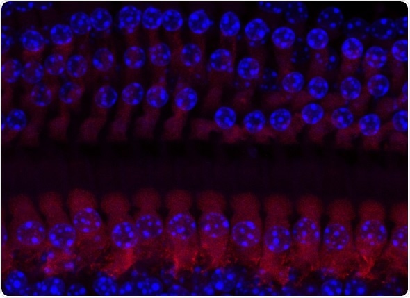 Organ of Corti whole-mount image, with sensory hair cells labelled with Myo7a antibody (red) showing 3 rows of outer hair cells (top) and one row of inner hair cells (bottom). Nuclei labelled with DAPI (blue). Credit: Elisa Martelletti