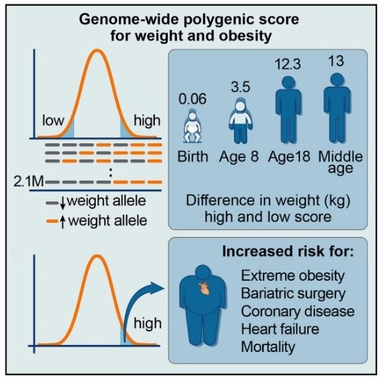 Researchers have come up with a scoring system based on genetic markers that predicts an individual's inborn risk for obesity. Using data from the largest existing genome-wide study of obesity, they applied new algorithms to integrate information from more than two million genetic variants affecting body mass index (BMI). The resulting score accurately predicted BMI and obesity in more than 300,000 individuals spanning birth to middle age. The work appears April 18 in the journal Cell.