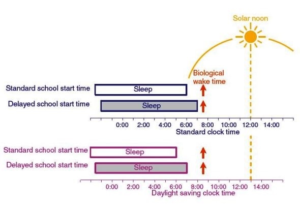 There has been a long-term, very active debate in the USA and other countries on the difficulties teenagers have in getting up for school. Similar discussions on school start times and on permanent daylight saving/standard time are happening in Europe. It seemed important to us to point out that moving to permanent daylight saving will undermine any benefits on sleep timing of shifting school start time later."