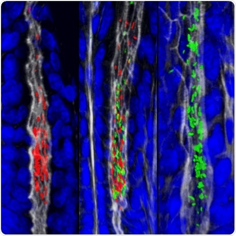 The gastric glands harbor unique populations of Helicobacter pylori, labeled in this image with two different fluorescent proteins. Credit: Connie Fung