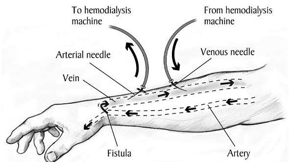 A diagram showing how kidney dialysis is conducted after an arteriovenous (AV) fistula surgery has provided access to the circulatory system. A new Johns Hopkins Medicine study reveals that many physicians are still performing a different, riskier procedure with a prosthetic graft for gaining access. Credit: National Institute of Diabetes and Digestive and Kidney Diseases/National Institutes of Health