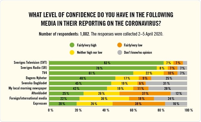 Evening tabloids like Aftonbladet and Expressen were generally not considered dependable, with only 25% and 20% of Swedes expressing their confidence in their reporting. An earlier survey, however, showed that more Swedes learned about current happenings concerning the coronavirus from these tabloids rather than the mainstream newspapers.
