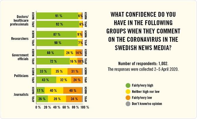 The survey also showed that Swedes trust the information issued by doctors and other healthcare professionals and researchers relative to other professional newsgroups and commenters. On the other hand, the second survey also showed that the percentage of people who said they trusted government officials went up by 12 points from 60 to 72 percent.