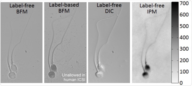 Imaging of the same sperm cells with typical qualitative microscopy methods and with quantitative IPM (holography), providing topographic OPD map, as obtained in my group. The color bar on the right represents OPD values in nm, for the holographic image. BFM = Bright field microscopy. DIC = Differential interference contrast, IPM = Interferometric phase microscopy (holography).
