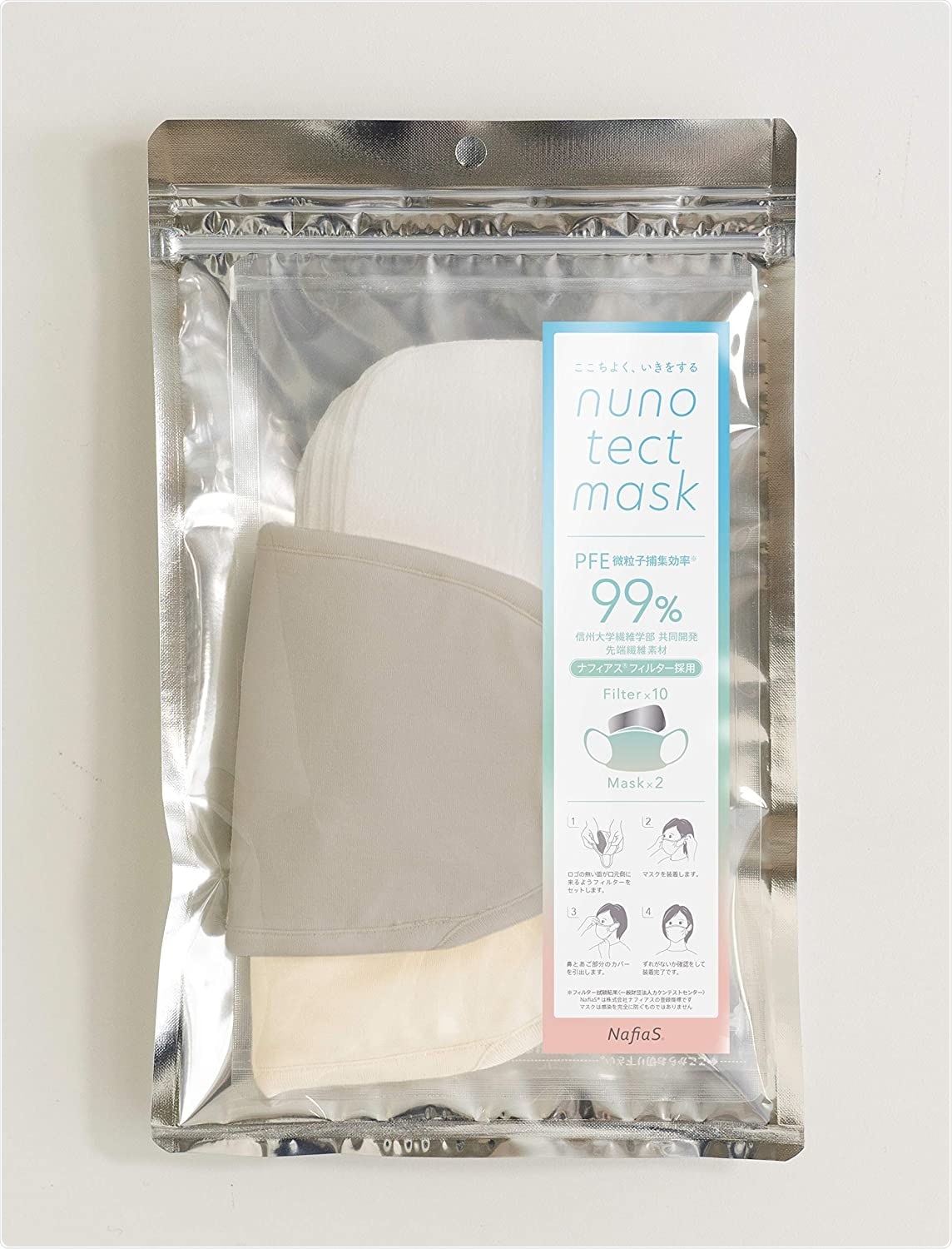 Filtration efficiency of both of the filters (melt-blown filter and the nanofiber filter) was 95% or more before use, which indicates that the respiratory organs of the wearer can be effectively protected. The tests also clarified that the inside of the filter can be effectively sterilized by spraying ethanol 3 times or more or immersing it in an ethanol solution for more than 5 minutes. However, when the mask was reused after the ethanol disinfection, the filtration efficiency of the melt-blown filter decreased to 64%. On the other hand, the nanofiber filter did not deteriorate in filter performance even after 10 or more uses.