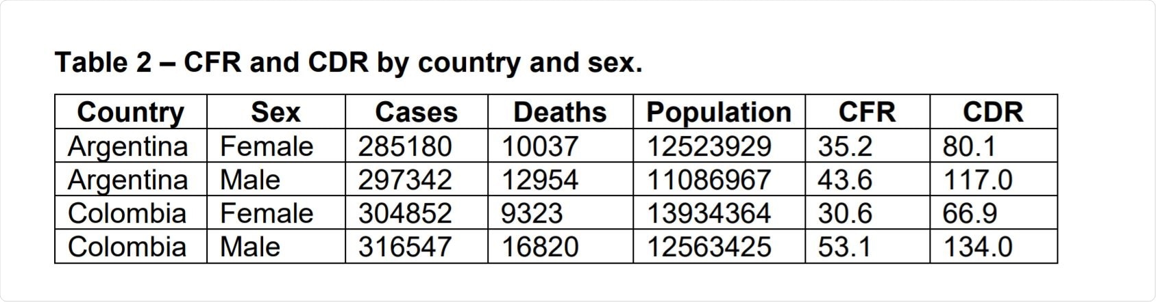 They found a crude death rate of about 52 in both countries, while the crude CFR varies by about 0.75 points per 1,000. This index stood at 28.4 and 29.2 for Argentina and Colombia, respectively. Both parameters are higher for men, but more significantly in Colombia.