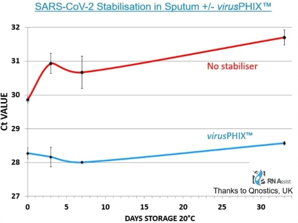 Public Health England and The Roslin Institute have demonstrated inactivation of SARS-CoV-2 within 10 minutes at 20°C. Qnostics UK have also demonstrated SARS-CoV-2 RNA stabilisation for 33 days at room temperature, and 12-month stability of 2 HCV strains at 20°C.