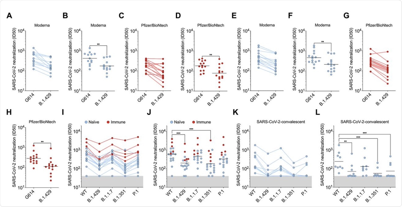 The scientists of the current study carried out direct comparisons of neutralizing capacity with plasma from individuals who had received two doses of either of the mRNA vaccines, from a week to a month after the second dose. All samples contained neutralizing antibodies; however, the average potency of neutralization was reduced by approximately two-fold when tested against pseudoviruses carrying B.1.427/B.1.429 S protein.