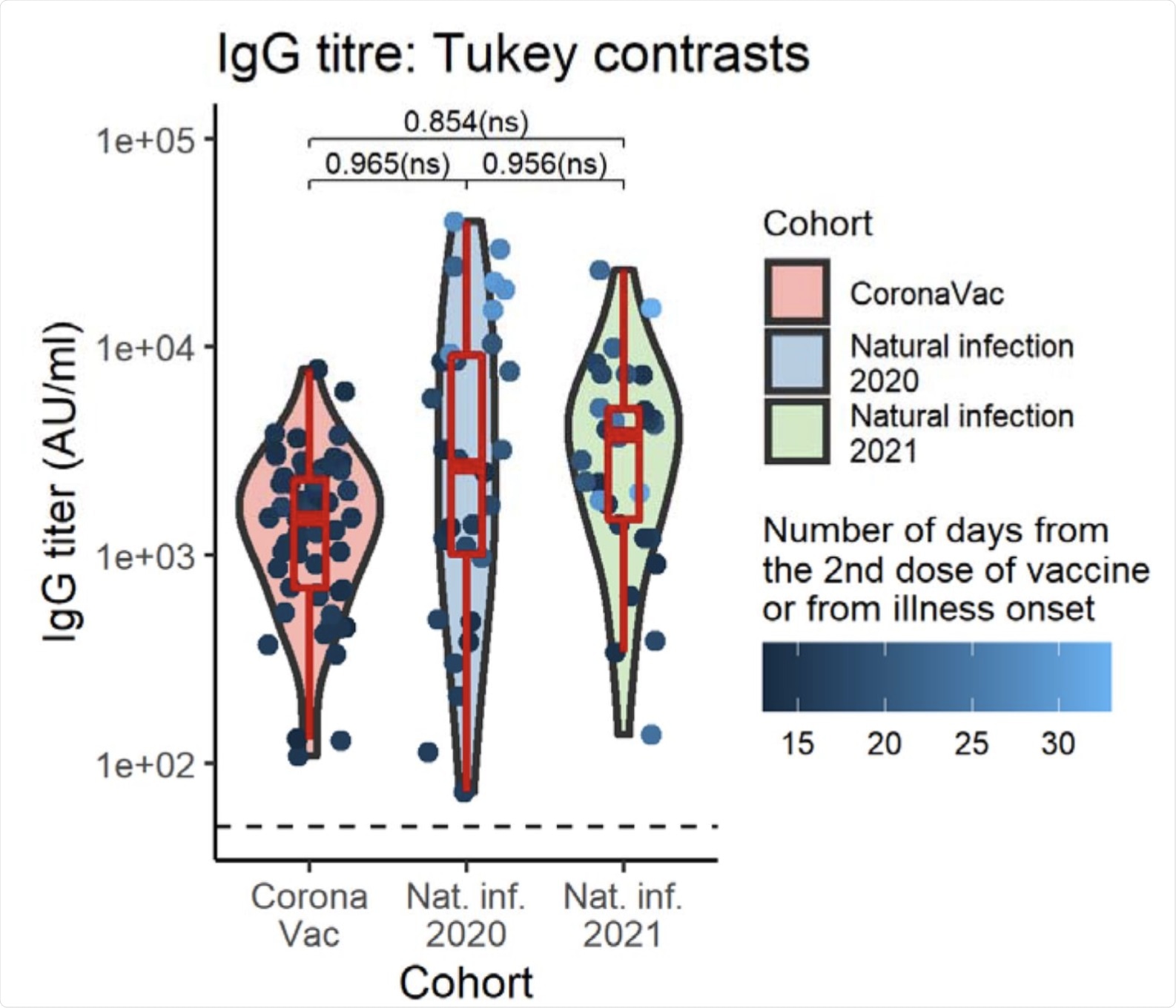 Violin plots of IgG titer by cohort group. Boxplots indicate medians and IQRs. The horizontal dotted line indicates the threshold for positive detection (50 AU/ml). There was no significant difference in SARS-CoV-2 S1-RBD-binding IgG levels between groups adjusting for patients’ sex, age, and serum collection date. Geometric mean IgG titer and 95%CI, computed at mean serum collection date (17.16 days), age (42.25 yr) averaged cross sexes: CoronaVac = 1741.28 (1240.48-2444.25) AU/ml; Natural infection 2020 = 1875.07 (1236.29-2843.89) AU/ml; Natural infection 2020 = 2034.54 (1340.47-3087.99) AU/ml. The data points are colored according to the serum collection date. The p values shown are Tukey-adjusted p-values.